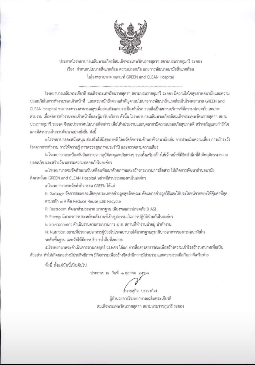 กำหนดนโยบายสิ่งแวดล้อม ความปลอดภัย และการพัฒนาอนามัยสิ่งแวดล้อมในโรงพยาบาลตามเกณฑ์ Green and Clean Hospital